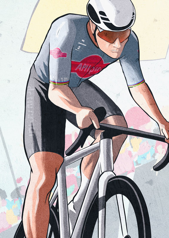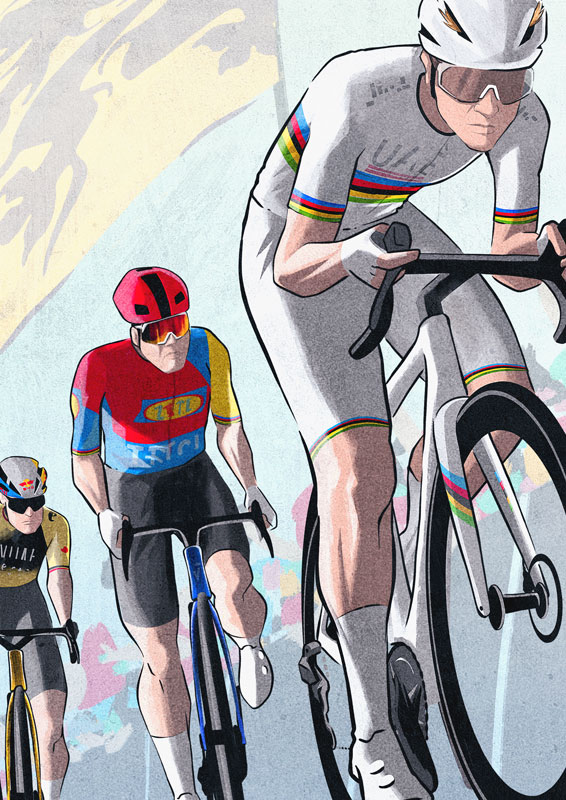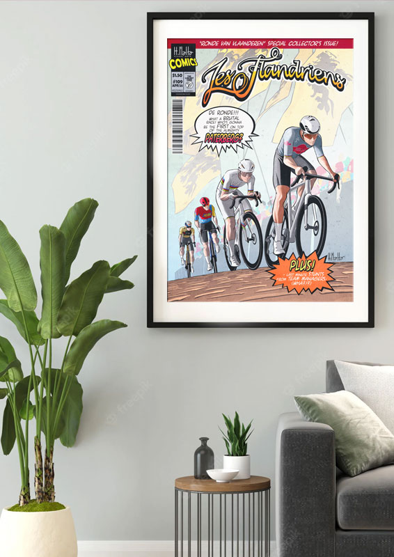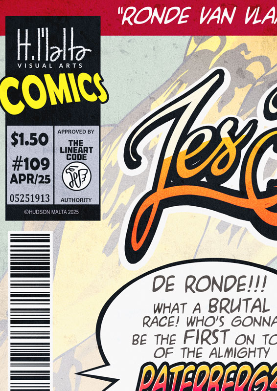 O Tour de Flanders retratado em estilo "Golden Era" das revistas em quadrinhos.