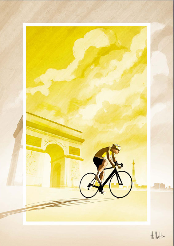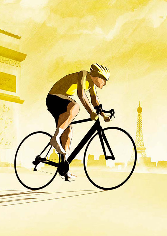 Nesta arte temos a camisa amarela, líder geral da prova, aquele que possui o menor tempo acumulado. Região caracterizada: Champagne.