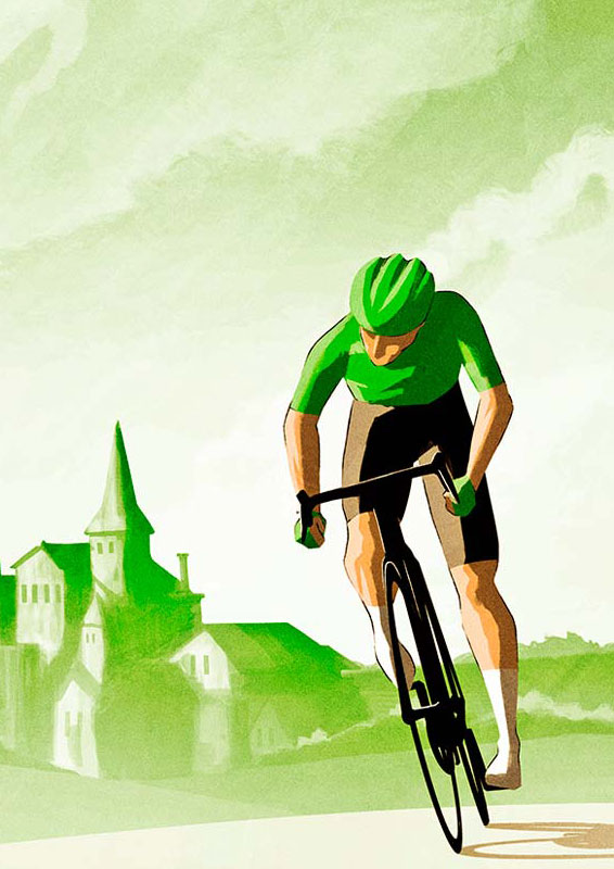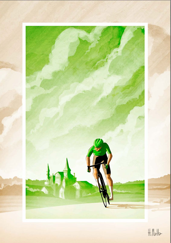 Nesta arte temos a camisa verde do líder por pontos, disputada em sprints e metas volantes. Região caracterizada: Bordeaux.