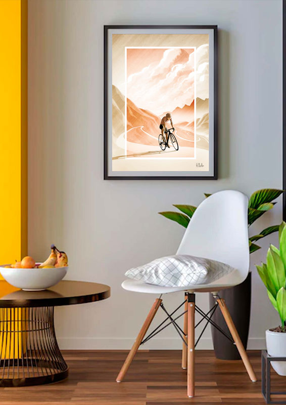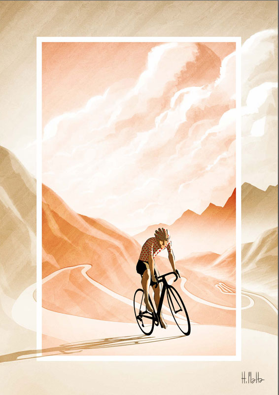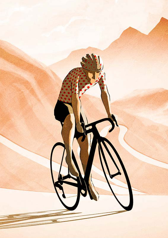 Nesta arte temos a camisa Polka Dot (branca com bolinhas) do líder de montanha, pontuação disputada nas subidas ou nas lendárias montanhas dos Alpes e Pirineus. Região caractarizada: Alpe dHuez.