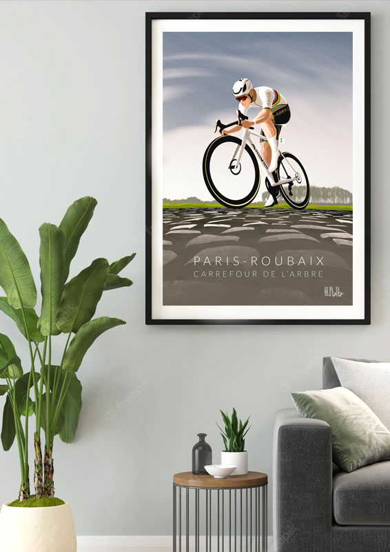 A Paris-Roubaix é uma das mais desafiadoras provas de ciclismo do circuito profissional, e não é a toa que é conhecida como "Inferno do Norte". Em 2024 foi vencida pelo neerlandês Mathieu Van Der Poel, que tem nesta arte a representação da sua passagem por um dos trechos decisivos em paralelepípedo, o Carrefour de L`Arbre.